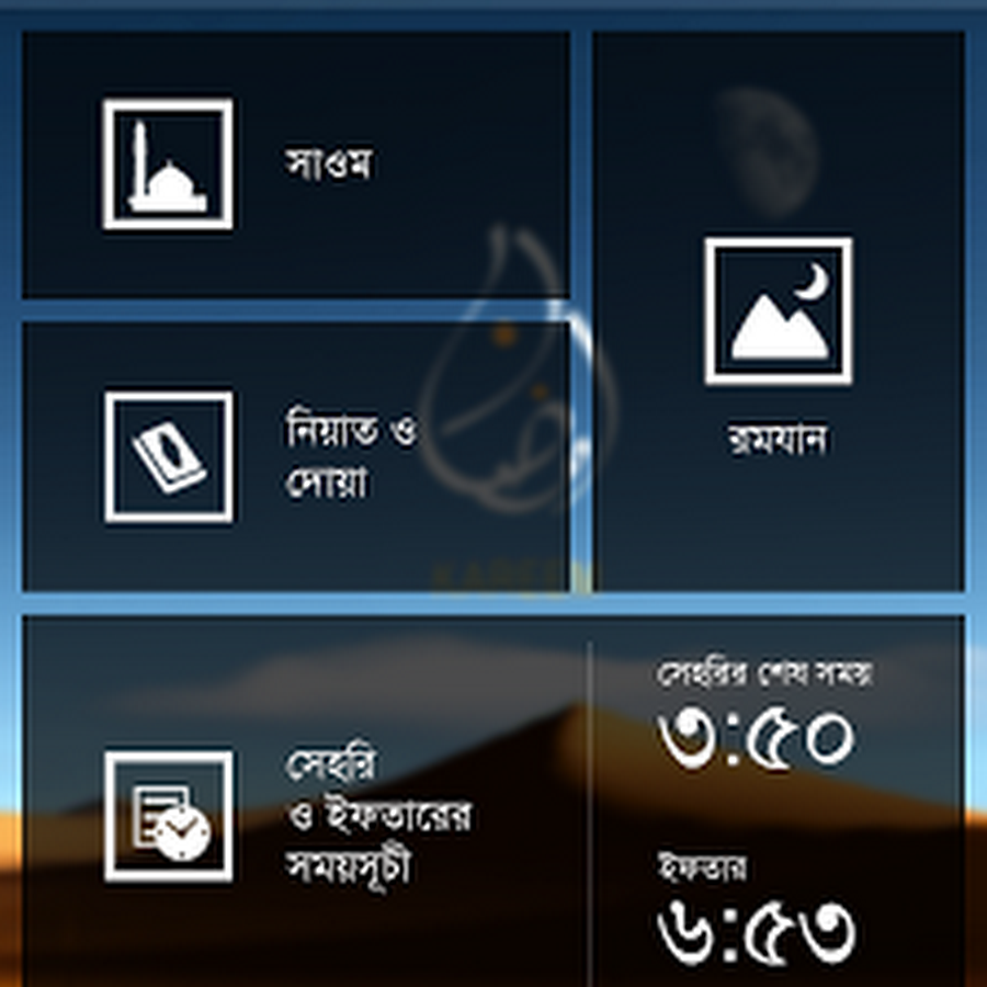 এই অ্যাপস এর মাধ্যামে বাংলাদেশের প্রত্যেকটি বিভাগের সেহরী ও ইফতারীর সময় জানা যাবে। এখানে এলার্ম দেওয়ার একটি অপশনও রয়েছে।